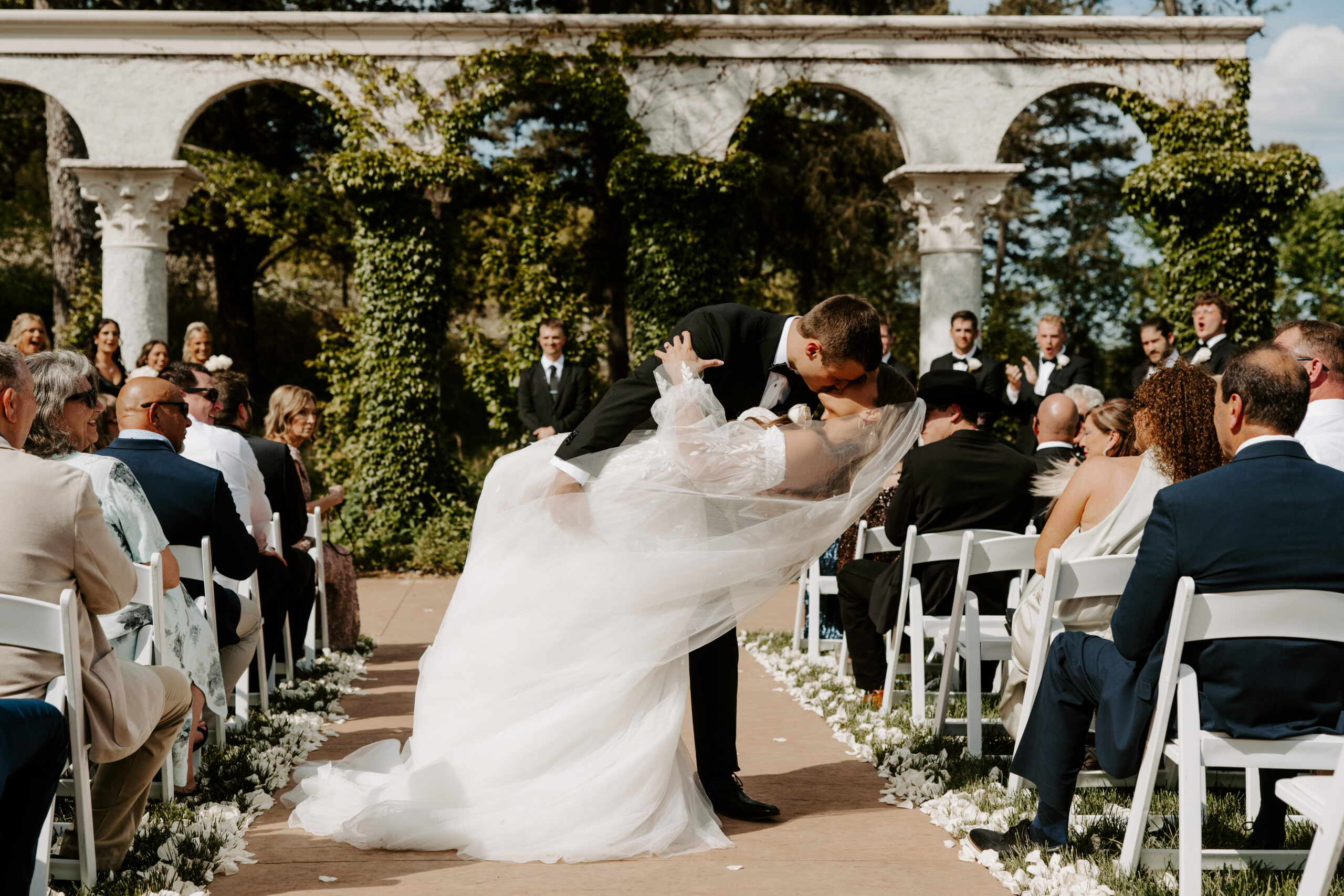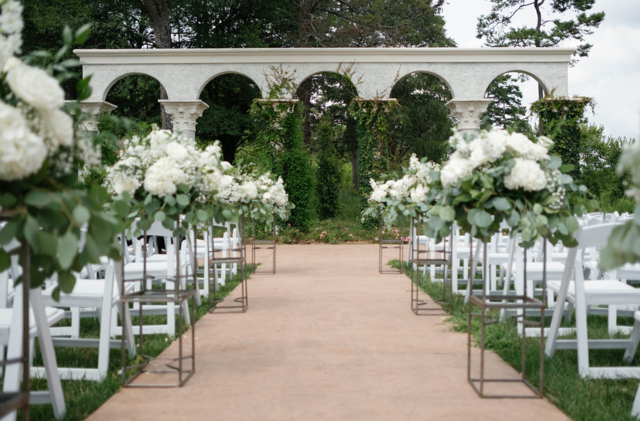 The outdoor ceremony site is framed by stucco pillars and arches, creating a truly spectacular ambiance for your guests.